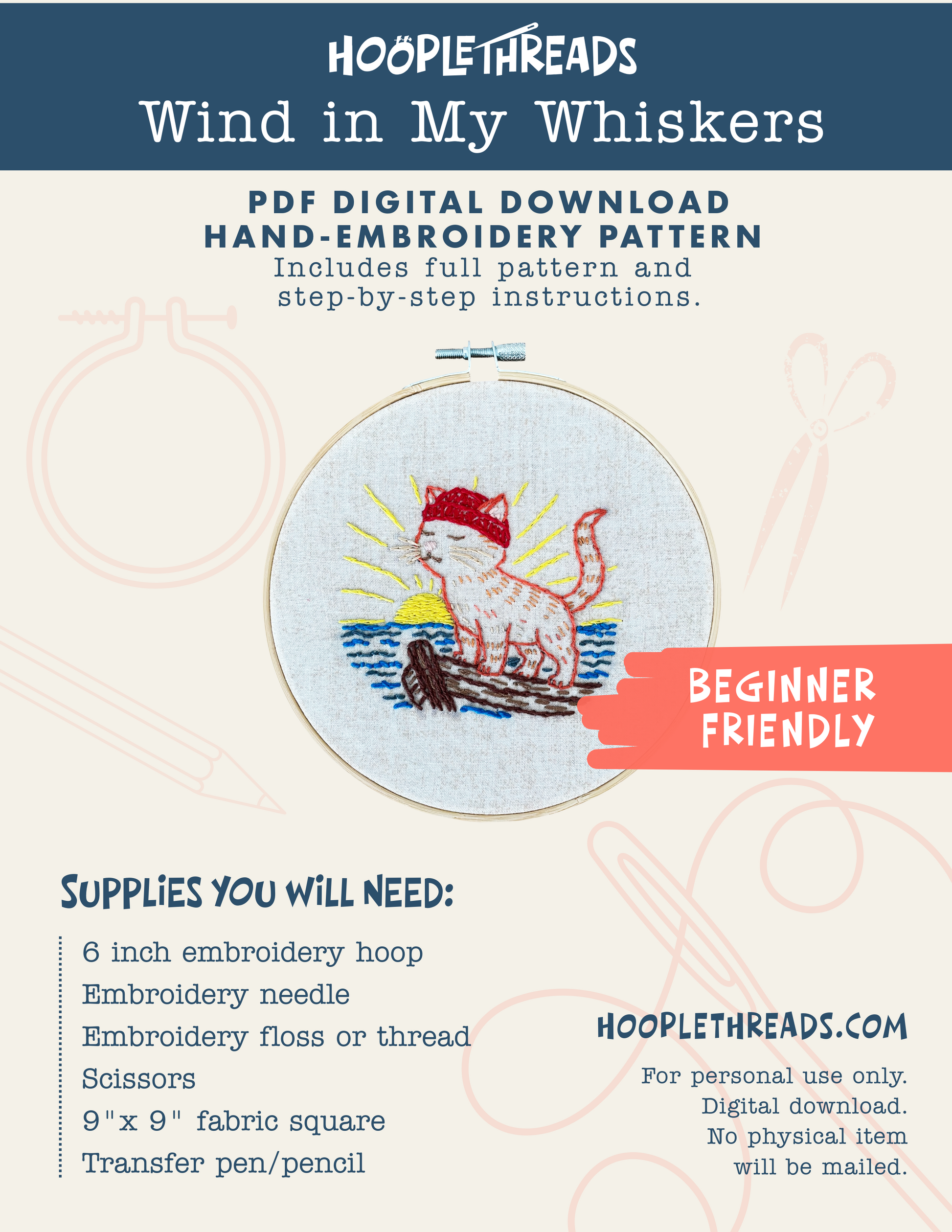Wind in My Whiskers is a beginner-friendly hand embroidery pattern featuring a content little cat, a red knit hat, and a breezy coastal moment. Calm, slightly whimsical, and designed to be approachable, this pattern is meant to be stitched slowly and enjoyed along the way.